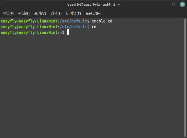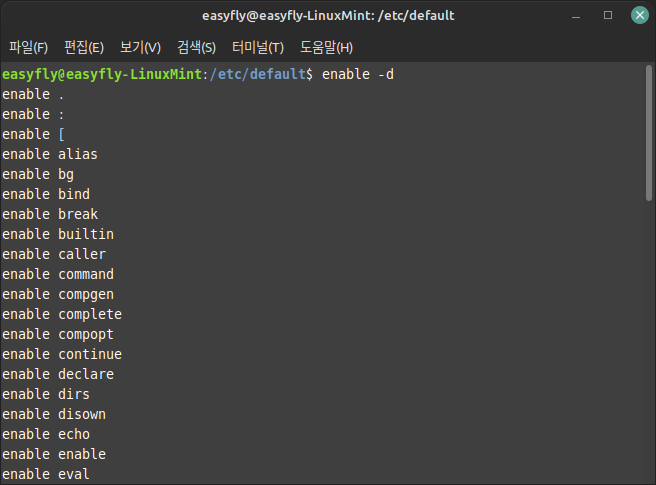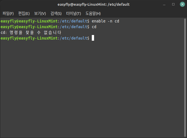 비활성화된 명령어를 다시 활성화하려면 'enable 명령어'로 다시 원상 복귀할 수 있습니다. 위 경우는 'enable cd'로 'cd' 명령어를 다시 활성화합니다.
