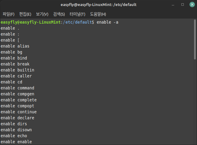 - `-a`: 모든 내장 명령어를 이름별로 표시합니다.
