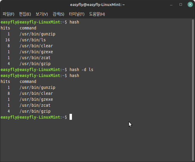 `hash` 명령어는 사용자의 쉘 세션 내에서만 유효하며, 쉘을 종료하면 `hash` 테이블도 초기화됩니다.