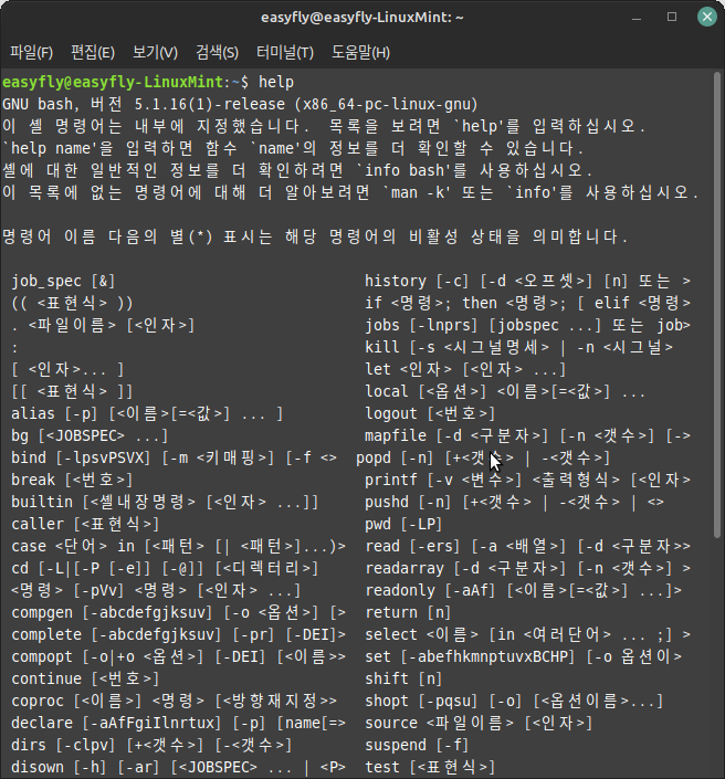 `help` 명령어는 bash 쉘에서 특히 유용하며, 사용자가 현재 사용 중인 쉘의 내장 명령어에 대한 정보를 빠르게 얻을 수 있게 도와줍니다.