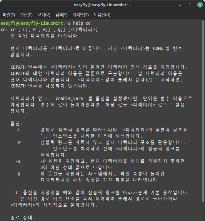 예를 들어, `cd` 명령어에 대한 도움말을 보려면 다음과 같이 입력합니다