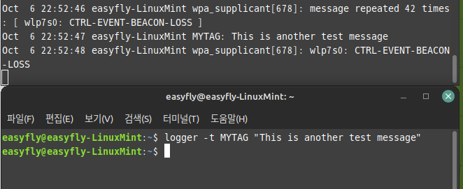 이 명령은 "MYTAG: This is another test message"라는 메시지를 시스템 로그에 기록합니다.