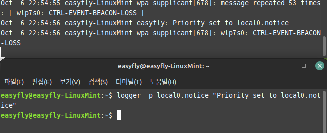 이 명령은 "Priority set to local0.notice"라는 메시지를 `local0.notice` 우선순위로 시스템 로그에 기록합니다.