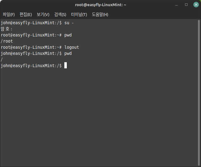 단순히 터미널에 `logout`을 입력하고 Enter 키를 누르면 현재 사용자가 로그아웃됩니다.