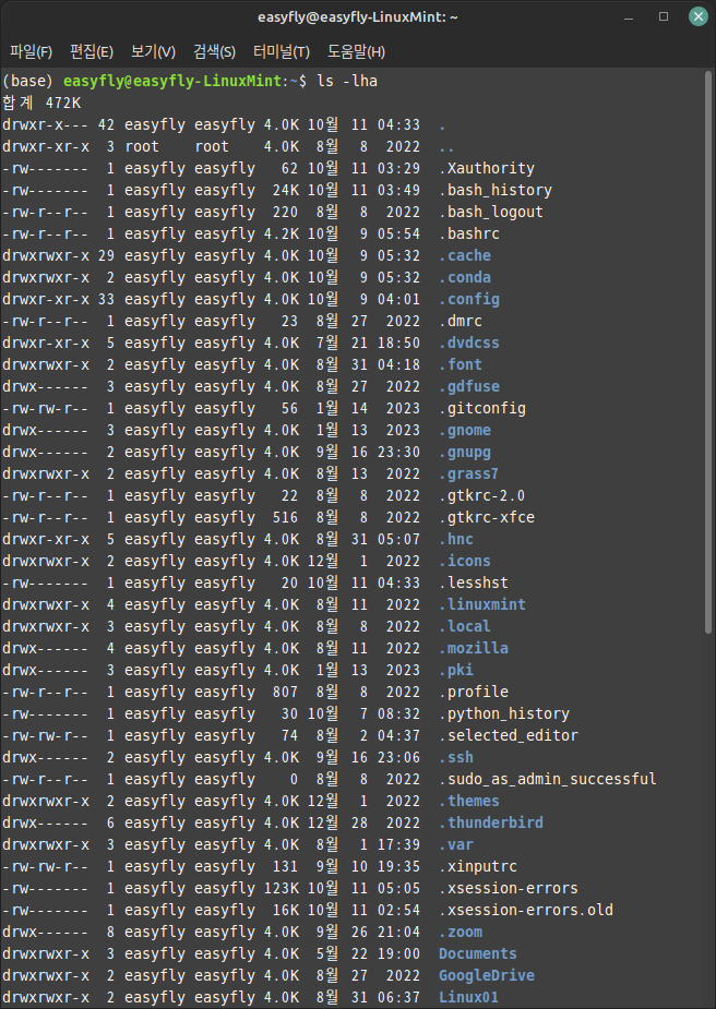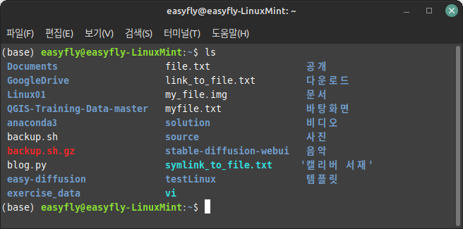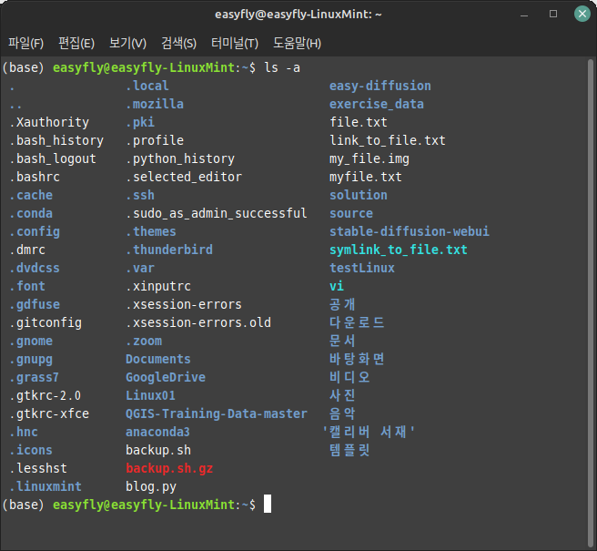 - `-a`: 숨겨진 파일을 포함하여 모든 파일을 나열합니다.