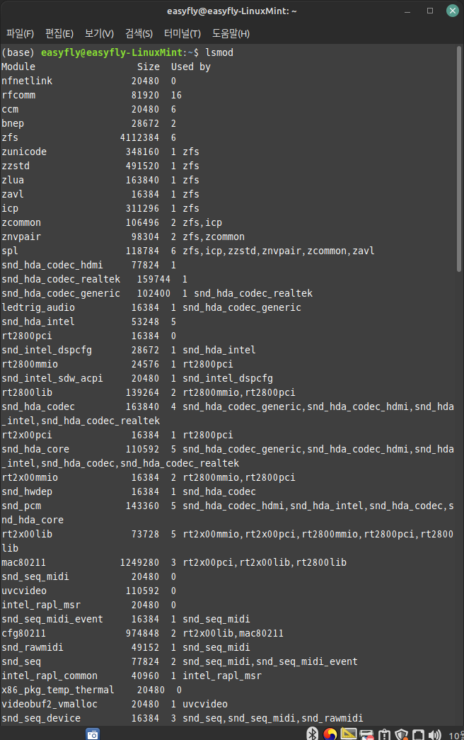 - `lsmod`는 현재 로드된 모듈만 보여주므로, 설치되어 있지만 현재 로드되지 않은 모듈은 나타나지 않습니다.