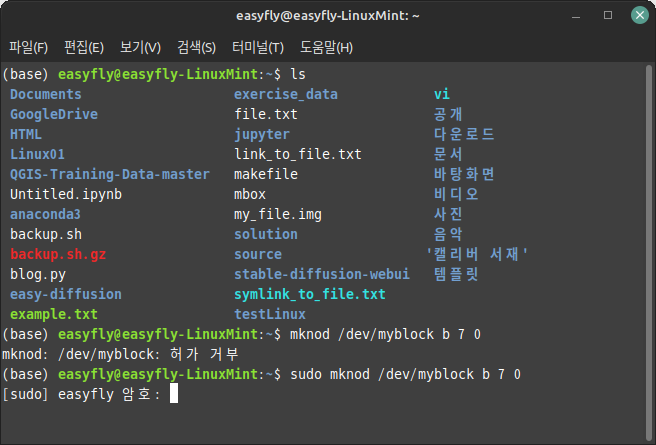 mknod를 사용할 일은 드물어졌습니다. mknod명령은 루트 권한이 필요합니다. 일반 사용자가 실행하려면sudo를 사용해야 합니다.