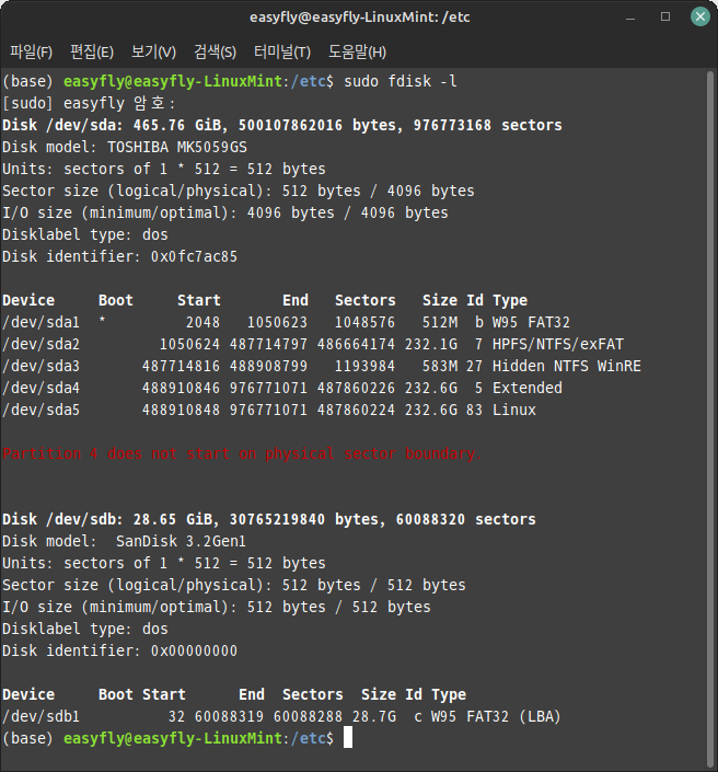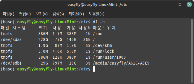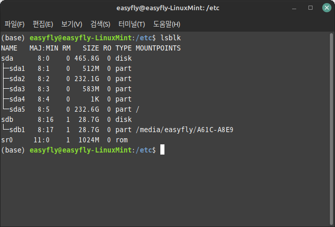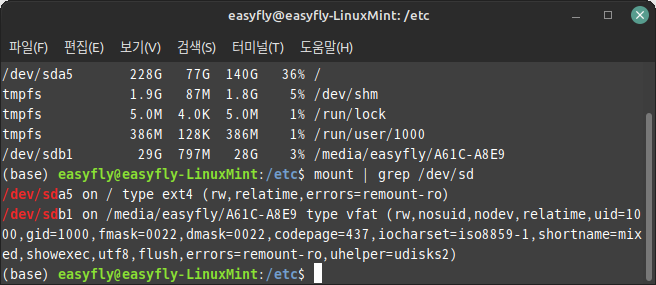 fdisk명령어를 사용하여 디스크에 대한 상세 정보를 확인합니다.이 명령어는 각 디바이스의 파티션 정보를 포함한 상세한 정보를 제공합니다. 여기서도 USB 드라이브를 찾을 수 있습니다. sudo fdisk -l- 마운트 상태 확인: