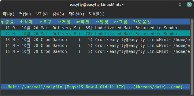 시작된 'mutt'에는 몇 개의 기본 메일이 리스트로 출력됩니다.