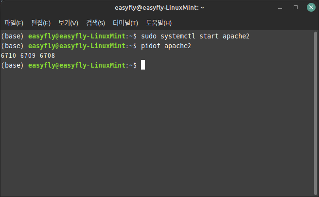 아파치 서버가 제대로 실행되고 있는지 확인하려면 다음 명령어를 사용합니다: