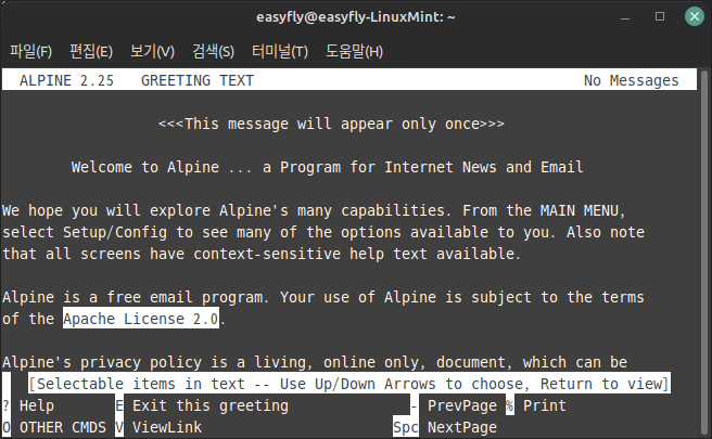 설치가 완료되면, 터미널에서 alpine을 실행하여 이메일 클라이언트를 시작할 수 있습니다.