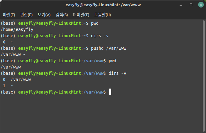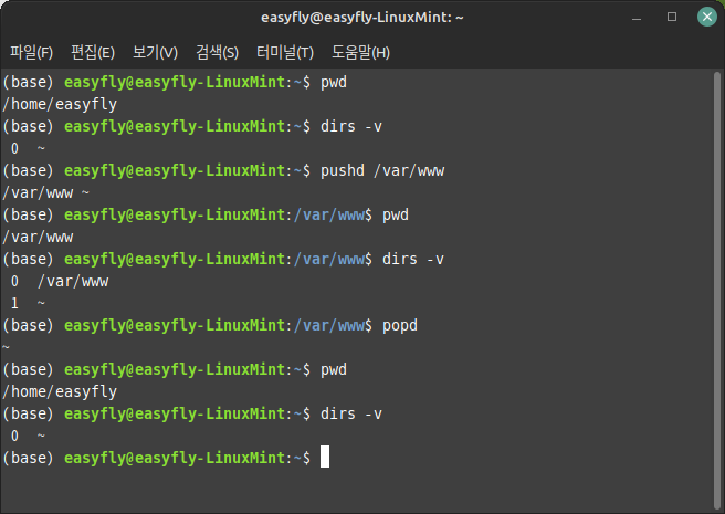 pushd를 사용하여 방문한 디렉터리들은 스택(stack)에 저장됩니다. 이 스택은 가장 최근에 방문한 디렉터리부터 순서대로 저장됩니다. - 디렉터리 제거 및 이동: