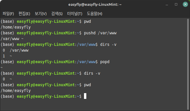 를 사용하면 현재 작업 디렉토리를 저장하면서 새 디렉토리로 이동할 수 있으며,popd
