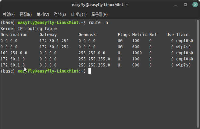 route -n- 이 명령어는 시스템의 라우팅 테이블을 보여줍니다.