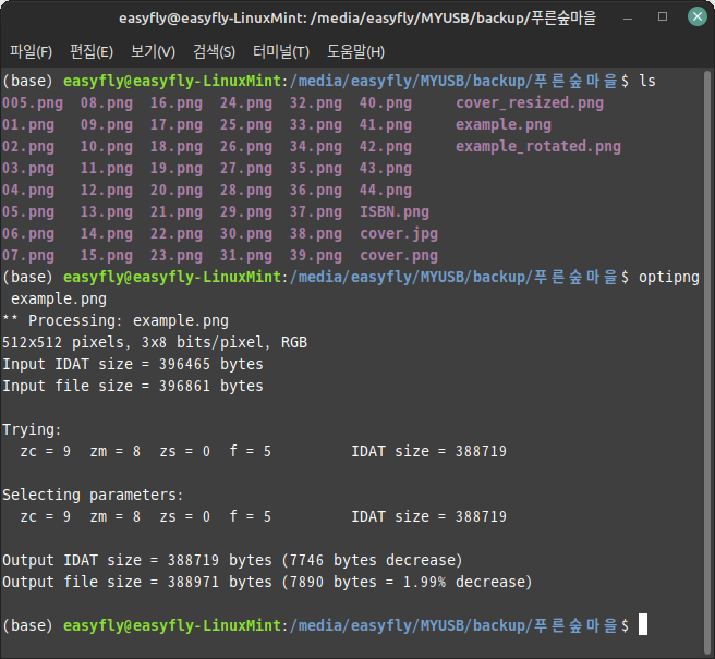 예를 들어, example.png라는 파일을 최적화하려면 다음과 같이 입력합니다: