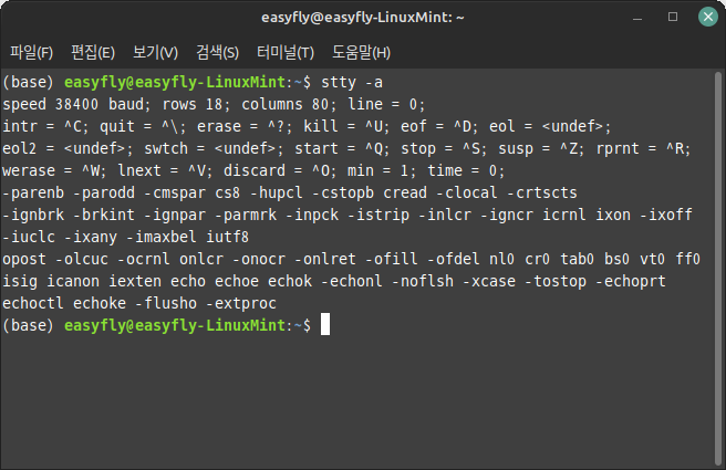 이 명령어는 현재 설정된 모든 터미널 옵션들을 상세히 보여줍니다.stty -a