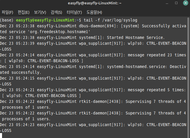 tail,cat,less같은 명령어를 사용하여 로그 파일을 확인할 수 있습니다.tail -f /var/log/syslog - 로그 서비스 재시작: 로그 서비스를 재시작하려면 다음 명령어를 사용합니다.