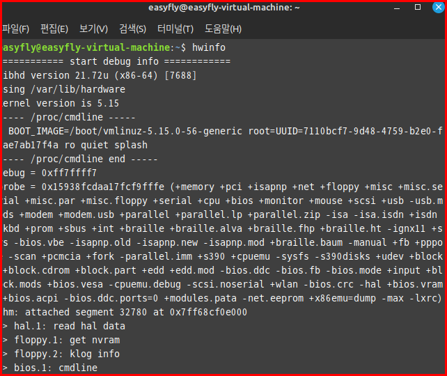 hwinfo: 하드웨어를 감지하고 상세 정보를 보여주는 툴입니다. 설치가 필요할 수 있습니다. 설치는 'apt install hwinfo'를 통해 가능합니다. apt는 "Advanced Packaging Tool"의 약자로, 데비안(Debian)과 그 파생 리눅스 배포판에서 사용되는 패키지 관리 시스템입니다. apt는 소프트웨어 패키지의 설치, 업데이트 및 제거를 쉽고 자동으로 처리하는 명령어라인 도구를 제공합니다.