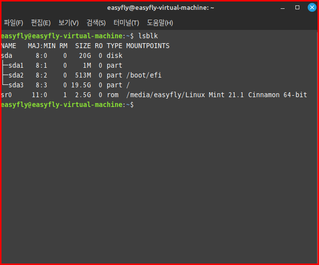 lsblk: 블록 디바이스(예: 하드 드라이브, 외장 드라이브 등)의 목록을 보여줍니다.