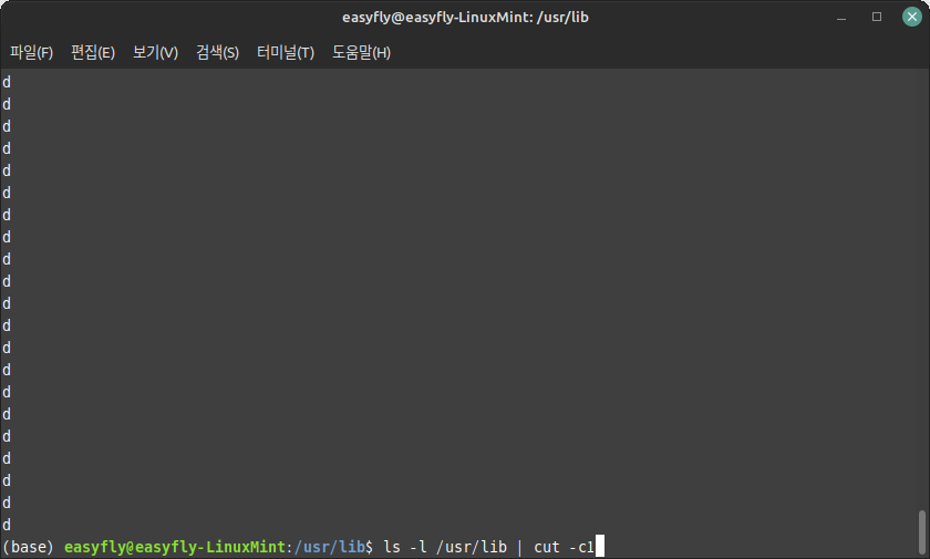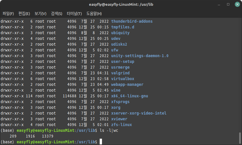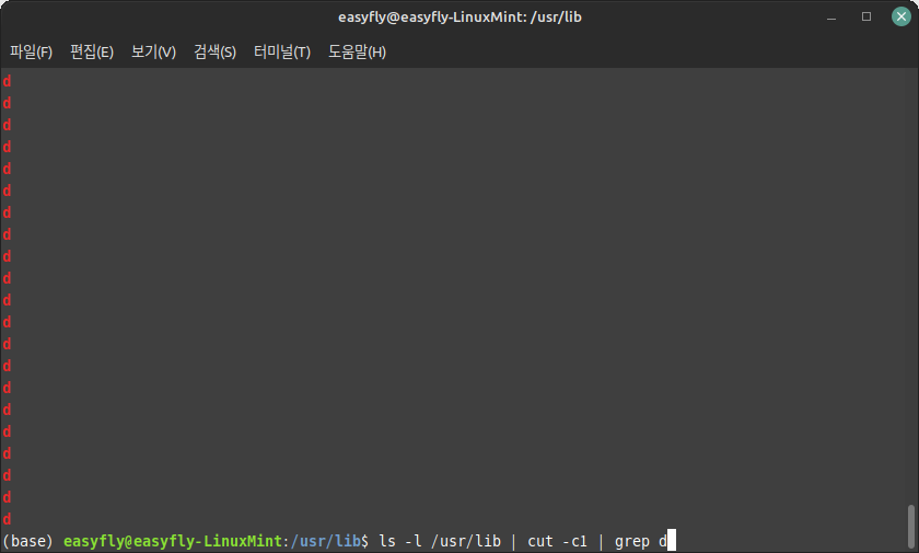 /usr/lib 디렉터리는 파일과 디렉터리가 많습니다. 이곳에 포함된 하위 디렉터리 개수를 파악하는데 'grep' 명령어를 사용하기로 합니다.