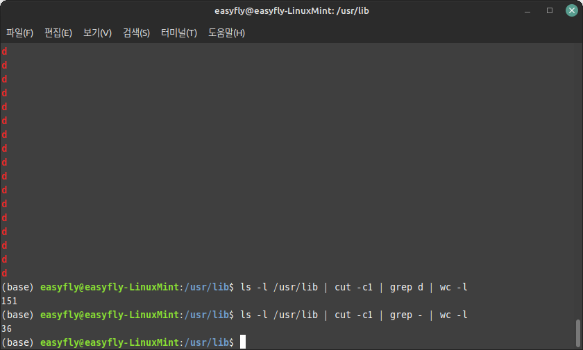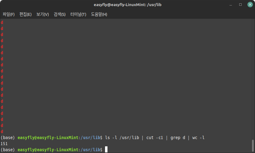 이어지는 작업은 'wc'를 사용하여 라인 수를 헤아리는 것입니다. 'ls -l /usr/lib | cut -c1 | grep d | wd -l'로 확인했더니 151개의 디렉터리가 포함되어 있습니다.