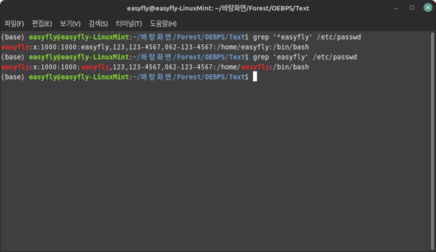 이 명령어는 /etc/passwd 파일에서 easyfly로 시작하는 모든 라인을 찾아서 표시합니다. 이 파일에는 시스템의 모든 사용자 계정 정보가 들어 있으며, 각 사용자는 한 라인에 기록됩니다.