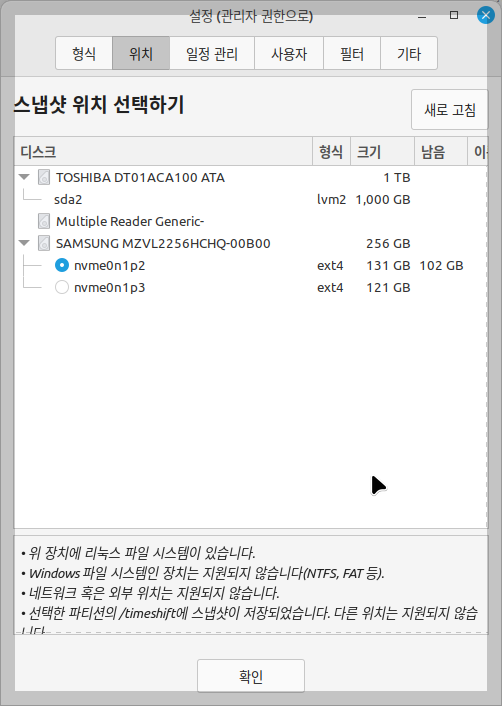 저장 공간은 기본적으로 '루트 파티션'과 '별도 파티션'을 지정할 수 있습니다. 타임시프트 프로그램의 '설정'에서 '위치' 탭에서 정할 수 있습니다. 설정을 확인하고 싶으면 '/etc/timeshift/timeshift.json'에서 가능합니다.