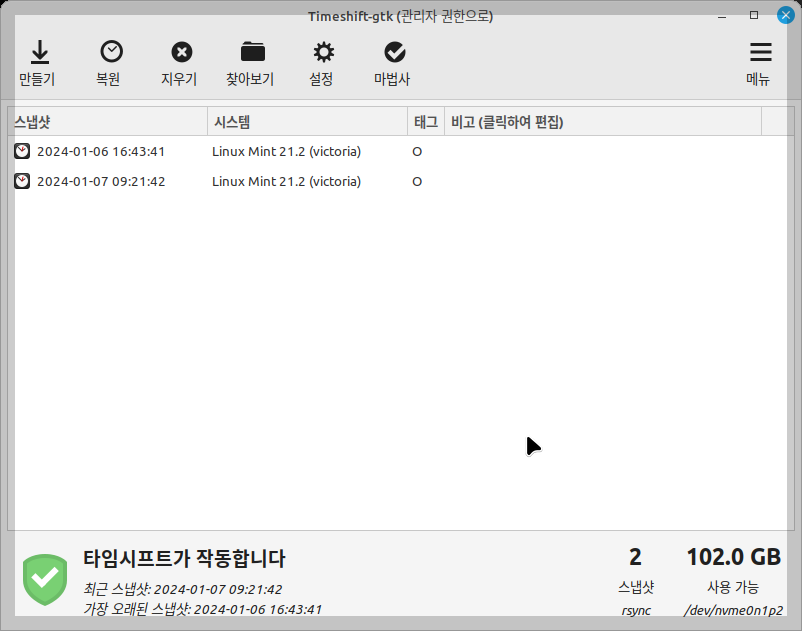 - 복원: 시스템이 손상되거나 문제가 발생했을 때 이전 스냅샷으로 시스템을 복원할 수 있습니다.