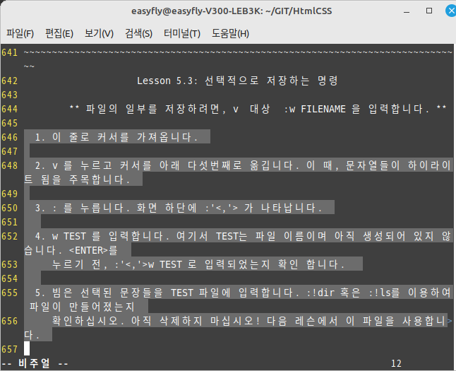 파일의 일부 내용을 저장하고자 할 때는 비주얼 모드를 사용하여 범위를 선택하고 저장합니다. 'w'는 'write'의 머리글자입니다. 뒤에 붙이는 인수의 이름으로 write 하라는 의미입니다.