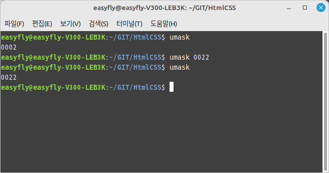 umask를 사용하여 현재 umask 값을 조회하거나 변경할 수 있습니다: