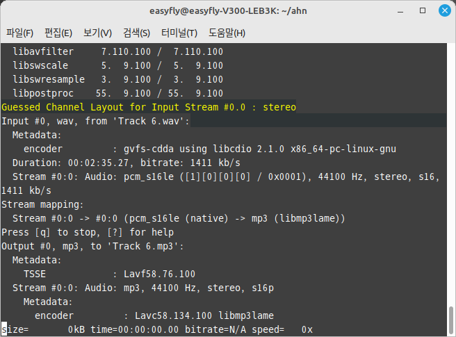 터미널을 열고 다음 명령어를 입력하여ffmpeg를 설치합니다.sudo apt-get update; sudo apt-get install ffmpeg- WAV를 MP3로 변환하기: