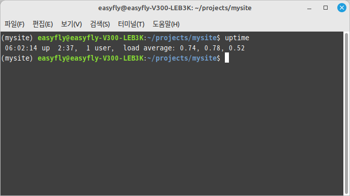 06:02:14은 현재 시간입니다.up 2:37은 시스템이 2시간 37분 동안 실행되었음을 의미합니다.1 user는 현재 시스템에 로그인한 사용자 수입니다.load average: 0.74, 0.78, 0.52는 시스템의 평균 부하를 나타냅니다. 이 값은 지난 1분, 5분, 15분 동안의 평균 CPU 부하를 나타냅니다.