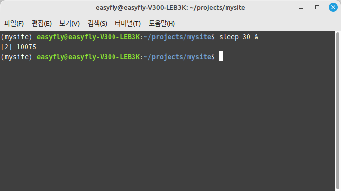 사용자가 터미널에서 sleep 30 & 명령어를 실행한 것을 보여줍니다. sleep 명령어는 시스템에게 지정된 시간(이 경우에는 30초) 동안 아무것도 하지 않고 기다리라고 지시합니다. & 기호는 명령어를 백그라운드에서 실행하라는 것을 의미합니다. 명령어가 백그라운드에서 실행되고 있음을 알려주는 작업 번호 [2]와 프로세스 ID 10075가 표시되어 있습니다.
