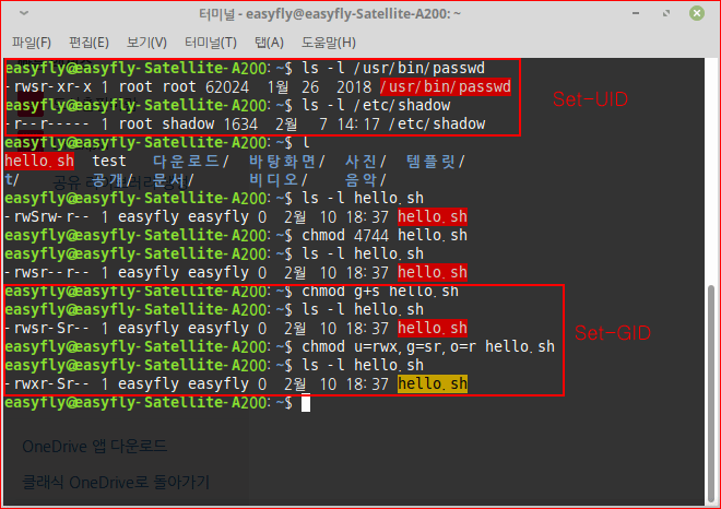 - Set-UID 비트를 설정하기 위해서는 소유자 허가권(u)에 's'를 추가(+)하거나 문자 또는 숫자 방식으로 설정할 수 있다. 숫자 방식으로 설정할 때는 가장 앞에 '4'를 붙인다.