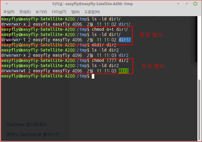 - 스티키 비트는 디렉터리에만 적용 가능하다. 모든 사용자가 모두 접근 가능하도록 특정 디렉터리에 모든 권한(rwxrwxrwx)을 지정할 수 있다. 하지만 이런 경우 사용자 누구라도 해당 디렉터리를 지울 수 있기 때문에 보안 결점이 발생한다. 이때 누구나 접근 가능한 디렉터리이지만 삭제는 원하지 않을 때 스티키 비트를 사용한다. 스티키 비스를 디렉터리에 지정하면 누구나 그 안에 디렉터리나 파일을 생성할 수는 있지만, 삭제는 오직 그 파일을 소유한 사용자만 가능하다