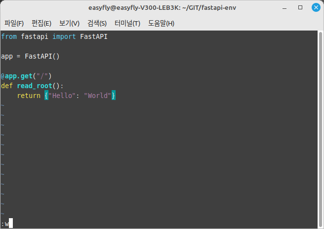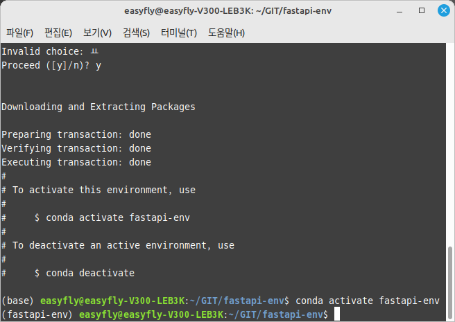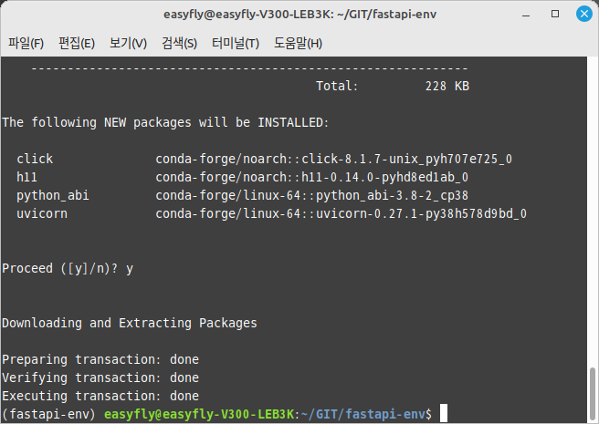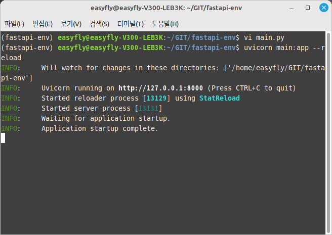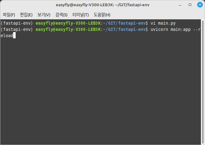 fastapi-env가상 환경을 생성하고 활성화합니다. - 패키지 설치: 가상 환경에 FastAPI와 Uvicorn을 설치합니다.