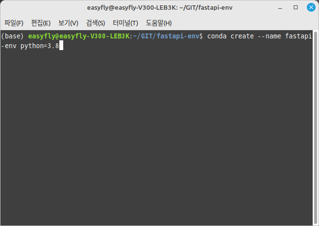 아나콘다 프롬프트(또는 터미널)에서 아래 명령어를 사용하여 fastapi-env라는 이름의 가상 환경을 생성합니다. Python 버전을 명시할 수 있으며, FastAPI는 Python 3.6 이상에서 작동합니다.