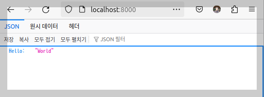 브라우저를 열고 http://127.0.0.1:8000/ 주소로 접속합니다. 정상적으로 서버가 작동하면, 다음과 같은 JSON 응답을 볼 수 있습니다.