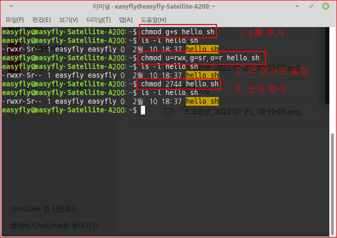 - Set-UID 비트를 설정하기 위해서는 소유자 허가권(u)에 's'를 추가(+)하거나 문자 또는 숫자 방식으로 설정할 수 있다. 숫자 방식으로 설정할 때는 가장 앞에 '4'를 붙인다.
