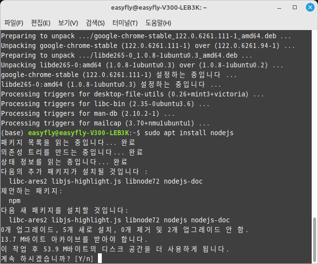 sudo apt install nodejs - (선택사항) npm(Node.js 패키지 매니저) 설치: