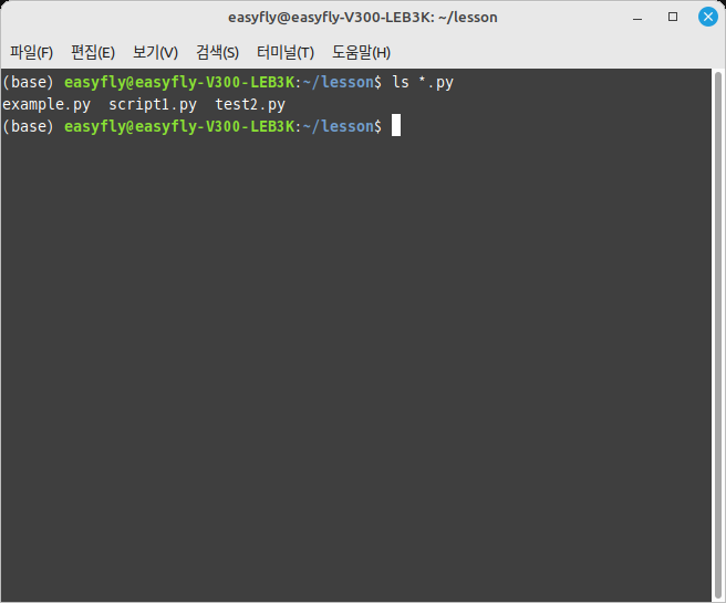 ls 명령어가 실행되면, 지정된 파일들의 목록이 터미널에 출력됩니다. 이는 사용자가 현재 디렉터리 내에서 Python 스크립트 파일들을 빠르게 확인할 수 있게 해줍니다.