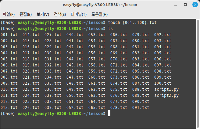 이 명령어는 001.txt부터 100.txt까지의 파일을 생성합니다. {001..100}는 1부터 100까지의 숫자를 3자리 형식으로 확장하며, 각 숫자에 대해 .txt 확장자를 가진 파일을 생성하라는 명령을 touch에 전달합니다.