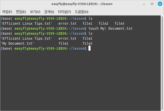 이 명령은 "My Document.txt"라는 이름의 파일을 생성합니다. \ 이스케이프 문자는 touch 명령어가 "My"와 "Document.txt"를 두 개의 별개 인자로 취급하는 것을 방지합니다.
