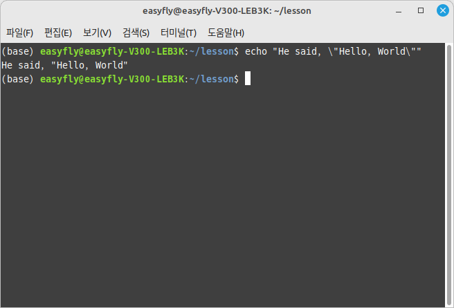 이 명령은 따옴표 안의 따옴표를 이스케이프 하여 문장 "He said, "Hello, World!""를 올바르게 출력합니다.