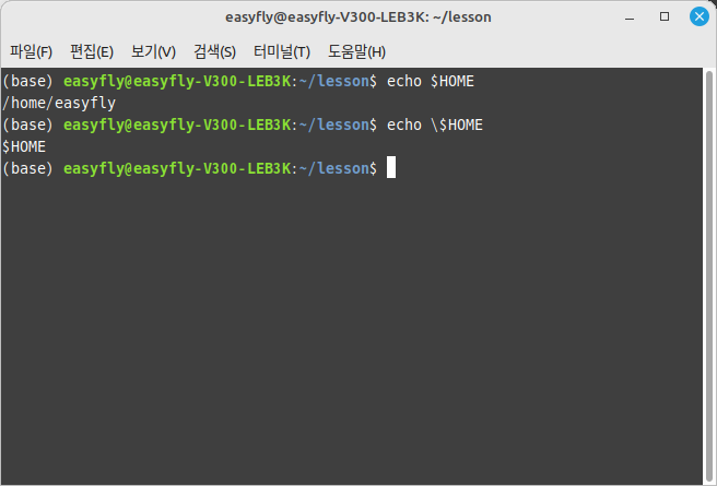 이 명령은 사용자의 홈 디렉터리 경로를 출력하는 대신, 리터럴 문자열 $HOME을 출력합니다.