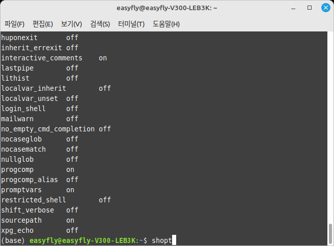 shopt -u [옵션명]- 모든 사용 가능한 쉘 옵션과 그 상태를 확인하려면: