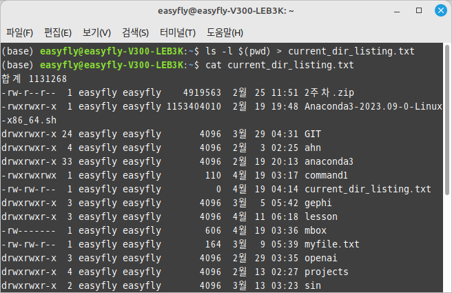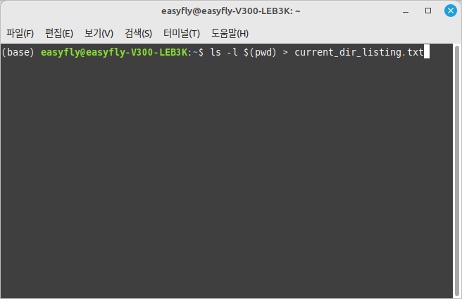 이 명령은 현재 작업 중인 디렉터리의 경로를 pwd 명령으로 가져와 ls -l 명령의 인자로 사용하고, 그 결과를 current_dir_listing.txt 파일에 저장합니다.