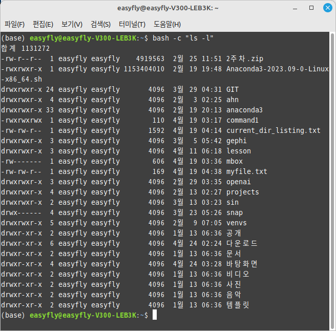 이 명령은 새로운 Bash 세션을 시작하고 ls -l 명령을 실행하여 현재 디렉터리의 파일들을 자세히 리스트 합니다.