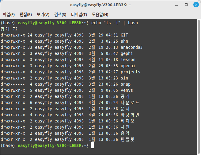 이 명령은 ls -l 명령을 echo를 통해 출력하고, 결과적으로 출력된 명령 문자열이 바로 bash로 파이핑되어 실행됩니다.