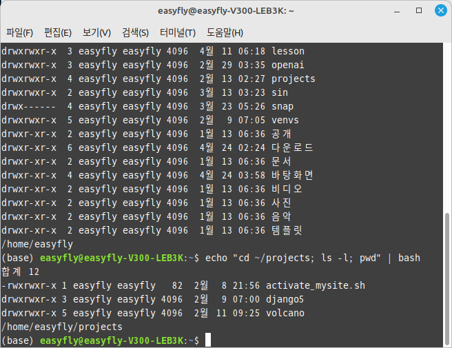 이 스크립트는 ~/projects 디렉터리로 이동한 후, 해당 디렉터리의 파일 목록을 출력하고, 마지막으로 현재 디렉터리의 경로를 출력합니다.